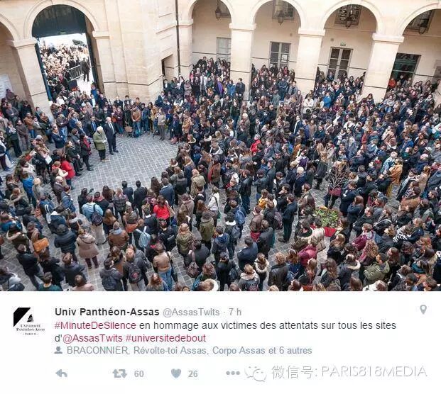 开始时是几个老师发言,阿尔诺?默西尔(Arnaud Mercier)教授说:“索邦大学有三名学生不幸遇难,马恩河谷大学也有两位教师遇难,恐怖分子看似无意地选择了人多的地方,但只要细想就会发现,他们选在一个上演美国摇滚乐团演出的剧院进行袭击,实际上就是对我们国家的年轻一代以及对我们生活方式的攻击!”