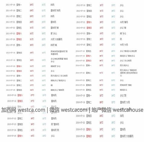2011-2016年,北京7月下旬天氣記錄,可見雨水甚多。
