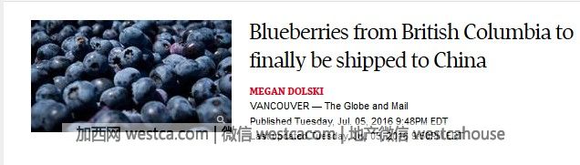 BC省政府于今年7月初就宣布,经过近10年进军中国市场的努力,BC省新鲜蓝莓于今年夏季开始,每年出口中国价值$6500万 的蓝莓,并且允许中国国家质检总局检疫官员驻扎BC省,对装船发货前的蓝莓进行预检。