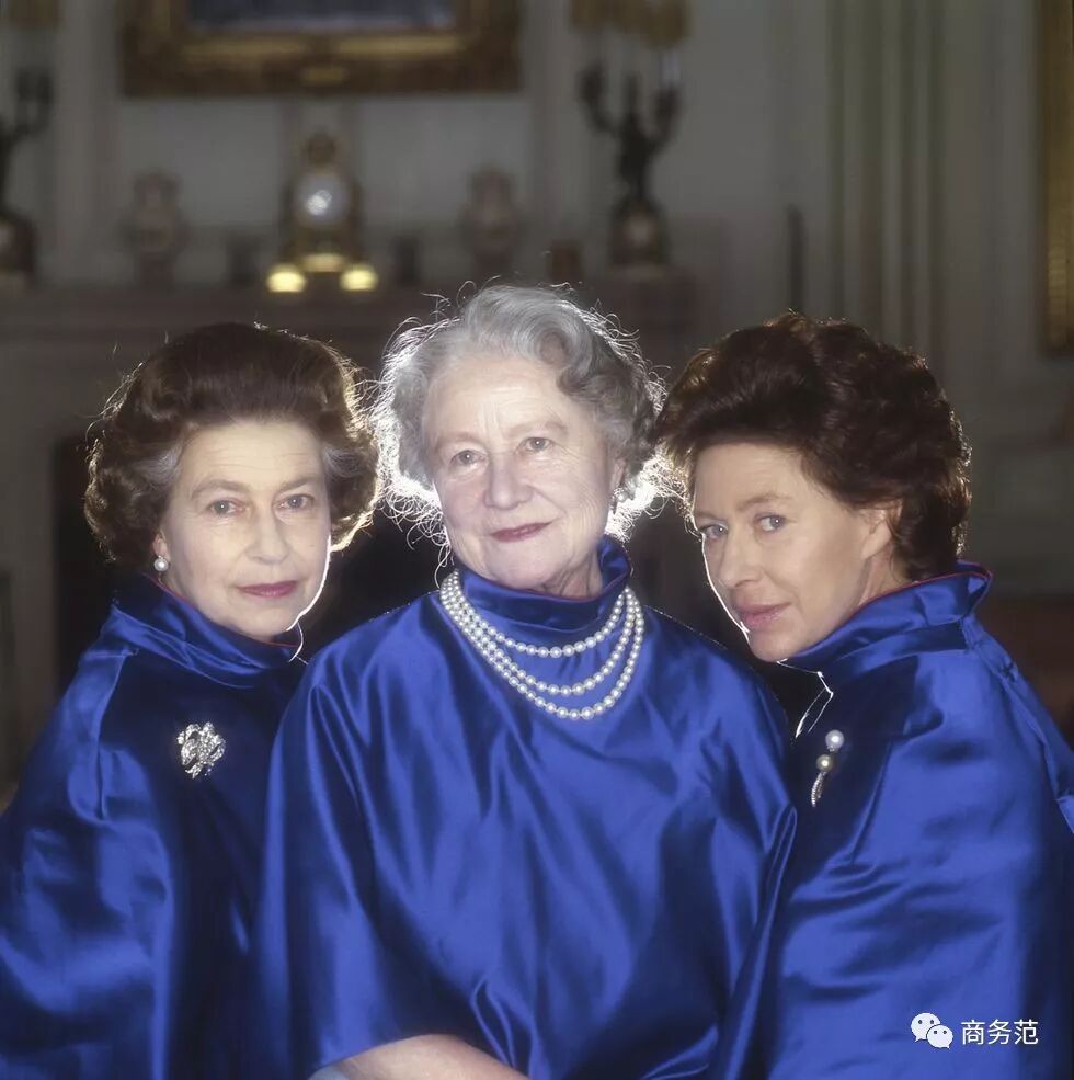再比如女王一家的这张合影,照片中女王、伊丽莎白王太后和玛格丽特公众,母女三人都穿着皇室蓝的外套,不仅显示了亲情,更显示了王家的贵气。