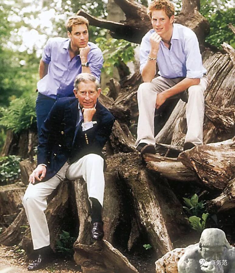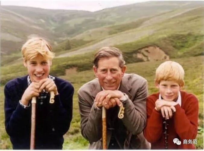 查尔斯王子年轻时和儿子们拍照,也特别喜欢设计一些动作,看着很是欢乐。比如这张拐杖三人组↓