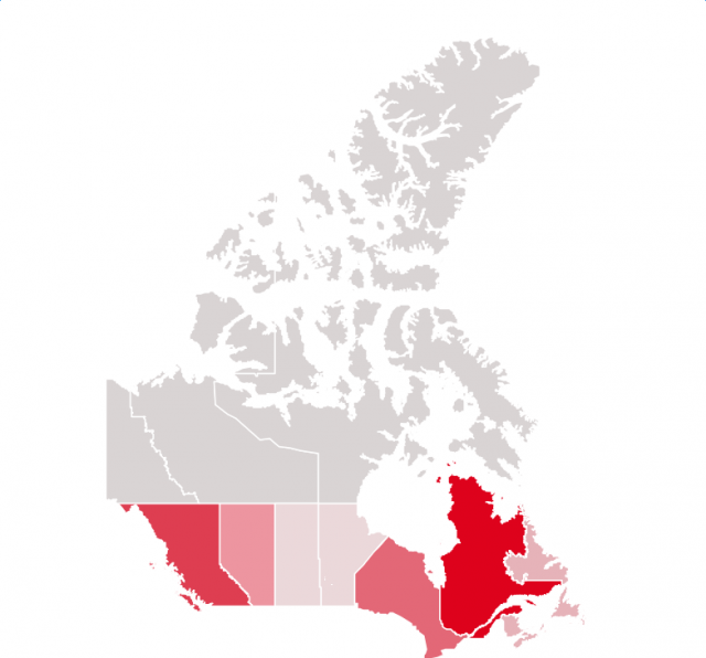 由于中国买家不断涌向蒙特利尔,以致当地居民担心该市房价会像温哥华多伦多一样猛涨。据房地产网站Zoocasa所做的全国调查,魁省民众最支持对外国买家收税,比例高达77%,虽然只有61%的人认为是外国买家推高了房价。而BC省民的支持率也排在后面,达到75%(图中颜色越深说明支持率越高):