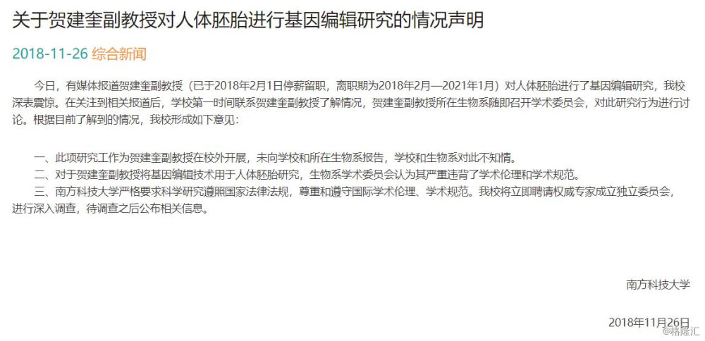 ¡¡¡¡ÍíÉÏ6µã×óÓÒ£¬ÄÏ·½¿Æ¼¼´óѧÖÕÓÚÔÚ¹ÙÍøÉÏ·¢²¼ÁËÒ»·ÝÉùÃ÷£¬³ÆºØ½¨¿ü¸±½ÌÊÚÒÑÓÚ2018Äê2ÔÂ1ÈÕͣнÁôÖ°£¬ÀëÖ°ÆÚΪ2018Äê2ÔÂ-2021Äê1Ô¡£¶ÔÓںؽ¨¿ü¸±½ÌÊÚ½«»ùÒò±à¼­¼¼ÊõÓÃÓÚÈËÌåÅßÌ¥Ñо¿£¬Ñ§Ð£ºÍÉúÎïϵ¶Ô´Ë²»ÖªÇ飬¸ÃУÉúÎïϵѧÊõίԱ»áÈÏΪÆäÑÏÖØÎ¥±³ÁËѧÊõÂ×ÀíºÍѧÊõ¹æ·¶¡£