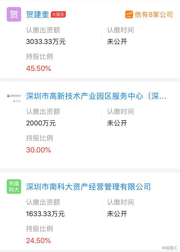 ¡¡¡¡ºØ½¨¿üÆìÏÂ×¢²á×ʱ¾×î¸ß£¨6666.66ÍòÔª£©µÄ¹«Ë¾£¬ÊÇÉîÛÚÊÐÄÏ¿ÆÉúÃü¿Æ¼¼ÓÐÏÞ¹«Ë¾£¬¹É¶«·Ö±ðΪºØ½¨¿ü£¨³Ö¹É45.5%£©¡¢ÉîÛÚÊиßм¼Êõ²úÒµÔ°·þÎñÖÐÐÄ£¨³Ö¹É30%£©¡¢ÉîÛÚÊÐÄϿƴó×ʲú¾­Óª¹ÜÀíÓÐÏÞ¹«Ë¾£¨³Ö¹É24.5%£©¡£