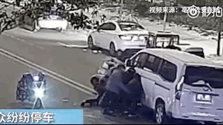 監控顯示,面包車司機當即下車開始抬車,想要救孩子,一旁過路的人見狀,也紛紛停車,合力抬車施救。