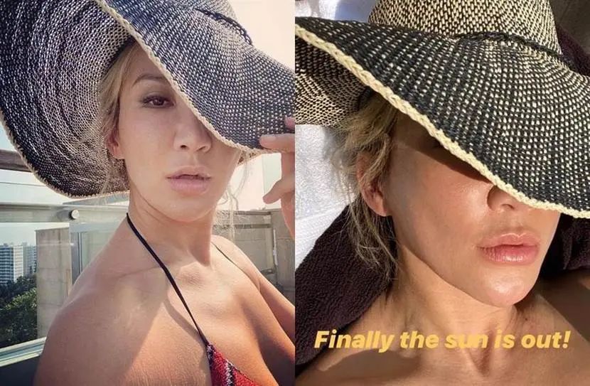 她将帽子轻轻拉下遮挡刺眼的阳光,露出精致的下颔和身材依然在线。