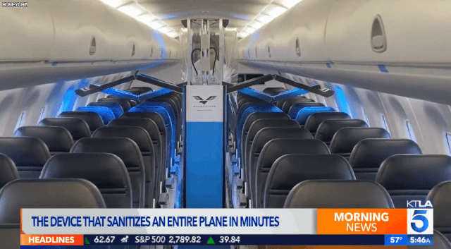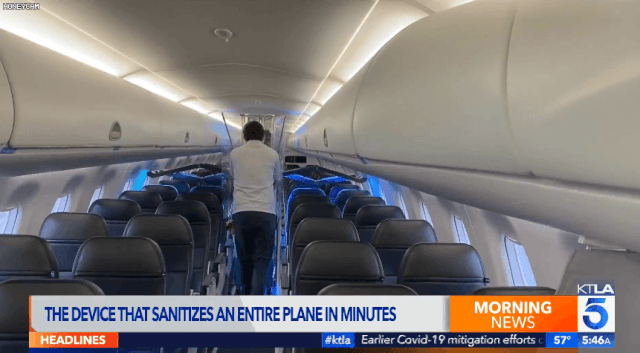 他说,空乘人员手推着这台类似于手推车的设备,沿着机舱中间的过道走一遍,就会完成对客舱的灭毒,这台灭毒机是利用强大的紫外线对飞机内部完成消毒。