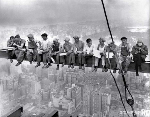 《摩天大樓頂上的午餐》,陪著工人朋友們在吊著的鋼梁上午休。