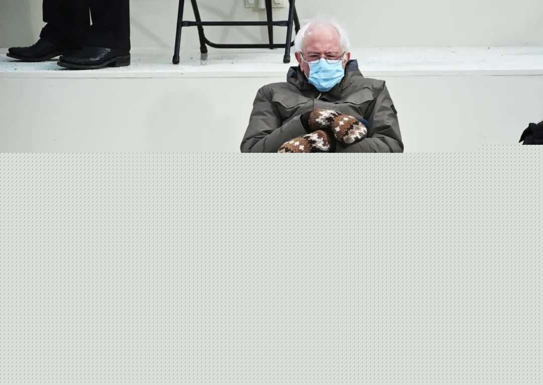 當天,眾多政客、明星都打扮了一番,唯獨Sanders獨自戴著口罩,裹著一件樸實厚大的外套,帶著連指手套,翹著二郎腿窩在椅子上,與其他坐在國會大廈台階上的人們形成鮮明的對比,從而引起全民注意。這張照片隨後蔓延全球社交平台,讓老爺子一夜爆紅,成為“表情包”中的頂級流量。