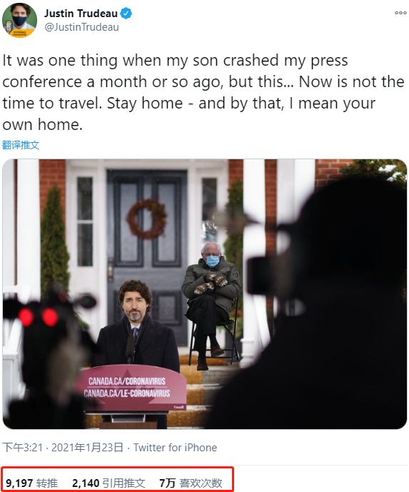 1月23日,杜魯多在個人推特上發了一張每日簡報的照片,後面的台階上也P上了紅遍全網的Sanders照片,並用作“反面教材”調侃道,“我兒子一個月前不請自來出現在我的記者會上也就算了,但是(如果Sanders出現在這就不太好了)...現在可不是旅行的時候。請大家待在家中!你自己的家中!”