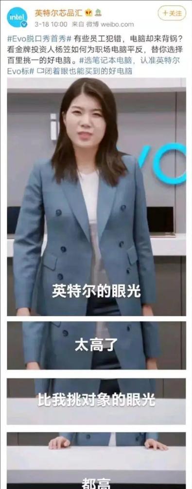¡¡¡¡3ÔÂ18ÈÕ£¬Ó¢ÌضûÆìÏÂ΢²©@Ó¢ÌØ¶ûоƷ»ã·¢²¼ÁËÒ»ÔòÑîóÒÐû´«Ïà¹Ø²úÆ·µÄÍÆ¹ãÊÓÆµ¡£ÑîóÒ±íʾ£º¡°Ó¢ÌضûµÄÑÛ¹âÌ«¸ßÁË£¬±ÈÎÒÌô¶ÔÏóµÄÑ۹ⶼ¸ß¡£¡± ²¢ÅäÎÄ£º¡°ÓÐЩԱ¹¤·¸´í£¬µçÄÔÈ´À´±³¹ø£¿¿´½ðÅÆÍ¶×ÊÈËÑîóÒÈçºÎΪְ³¡µçÄÔÆ½·´£¬ÌæÄãÑ¡Ôñ°ÙÀïÌôÒ»µÄºÃµçÄÔ¡£¡±