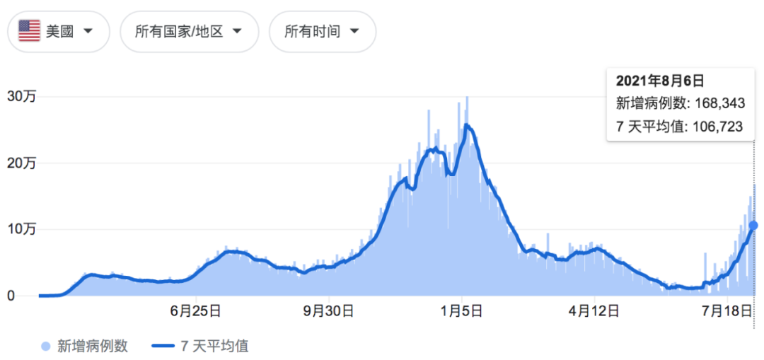 根据纽约时报的最新数据,8月6日美国单日新增新冠病例数超过16万例,7天平均值在10万以上。