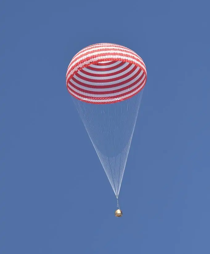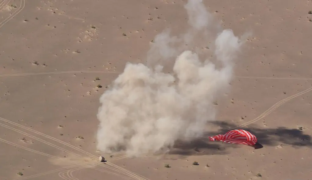 返回舱在8000米高度时,巨大的降落伞打开,不论多快的速度统统降为10米每秒,在距离地面大约1.5米时,反推力火箭装置发动,速度瞬间降为5米每秒。反推力火箭发动产生的巨大烟尘也让原本烧黑的返回舱变得更黑了些。