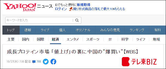 昨日(27日),日本(专题)雅虎新聞網站轉載了一篇分析日本蛋白粉漲價的報道,該文章的主要觀點是,中國“爆買”蛋白粉的原料之一乳清,致使乳清供應減少,日本進口乳清價格上漲,國內的蛋白粉價格也隨此水漲船高。