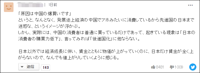 不過,對於“テレ東BIZ”的這番“怪中國”論調,許多日本網民根本不買賬。有網民就針對報道標題諷刺稱,“‘原因是中國的爆買’,這樣說總讓人覺得是發展中國中國像傻瓜一樣消費,連發達國家日本都覺得麻煩。但實際上,中國的消費者只是在正常購買,正在發生的現象是‘日本消費者的購買力下降’,換言之就是‘落後國家化’”。