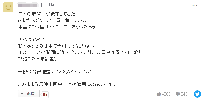 還有日本網民悲觀表示,日本不僅是購買力下降,更是全方位皆輸,且又不願意對一些既得利益者動刀,“這樣下去(日本)會不會變成發展中國家或落後國家?”