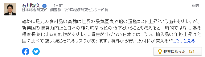 也有擔任日本綜合研究所調查部宏觀經濟研究中心所長的網民分析稱,誠然,日本食品價格暴漲的原因包括全球經濟復蘇和航運成本上升,但考慮到新興國家購買力的提高和日本相對地位的下降,這在一定程度上或將是長久狀態。該網民還指稱,在工資沒有增長的日本,這種進口商品的價格上漲與其他國家相比,可能導致更嚴重的風險。日本從海外購買廉價原料的時代可能正在結束。