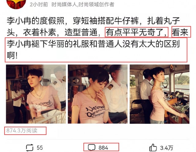 12月13日,有一位时尚博主在网上晒出了一组李小冉的度假照,并配文“李小冉的度假照,穿短袖搭配牛仔裤,扎着丸子头,衣着朴素,造型普通,有点平平无奇了,看来李小冉褪下华丽的礼服和普通人没有太大的区别啊!”这一组李小冉的度假照火了,还引起了网友们热议,阅读量超过了800万,网友评论数高达884条。