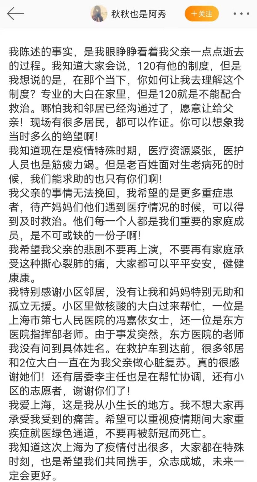 今天下午 3 点,当事人网友 " 秋秋也是阿秀 " 发文表示:当时我眼睁睁看着父亲一点点逝去,我知道大家会说,120 有它的制度,但在那个当下,让我如何去理解这个制度?