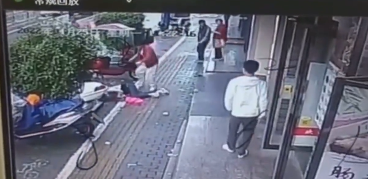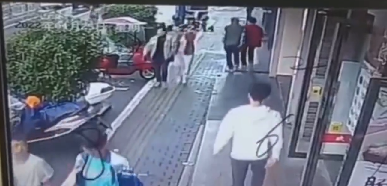 監控畫面顯示兩女子在人行道上挽手行走時,空中突墜一塊水泥塊直擊一女子頭部,該女子立即倒地不起。