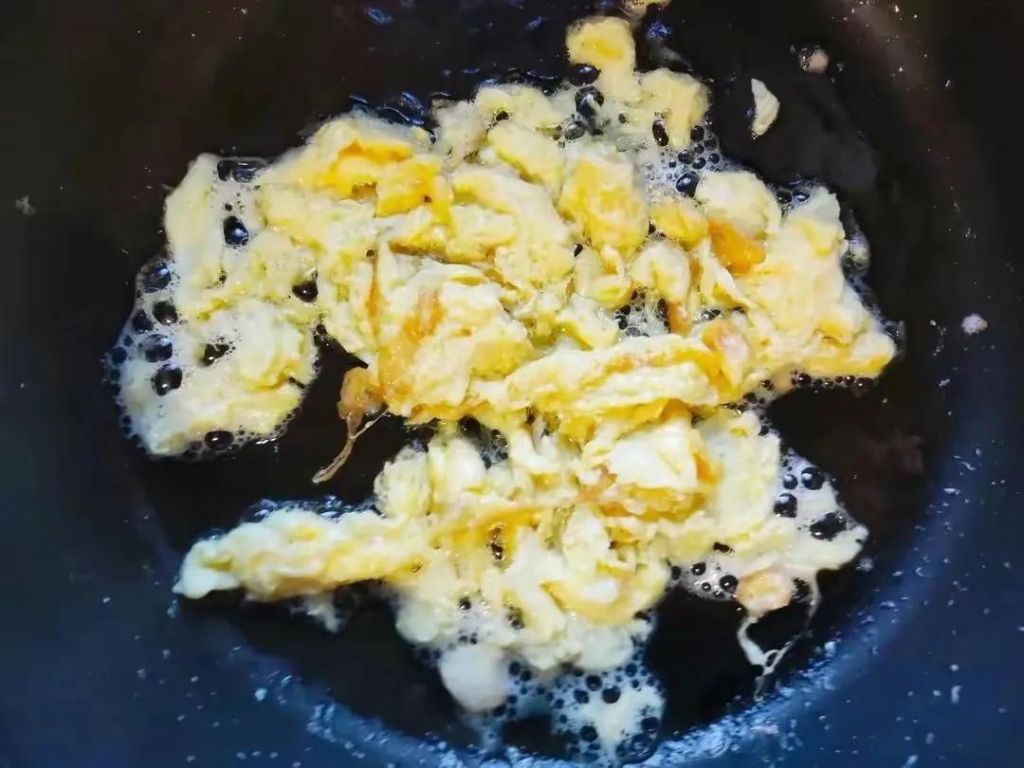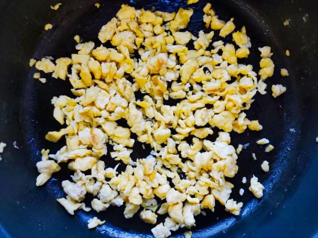 4、取个小碗,打入3个鸡蛋搅散,油热倒入鸡蛋滑熟,铲碎。晾凉。