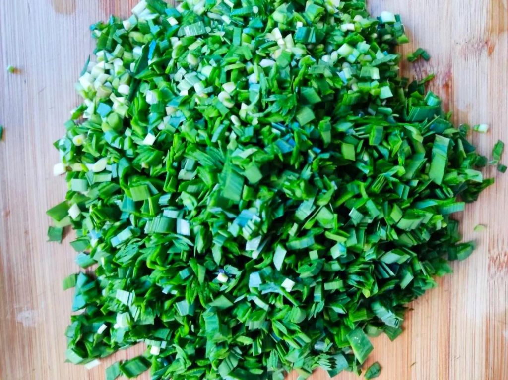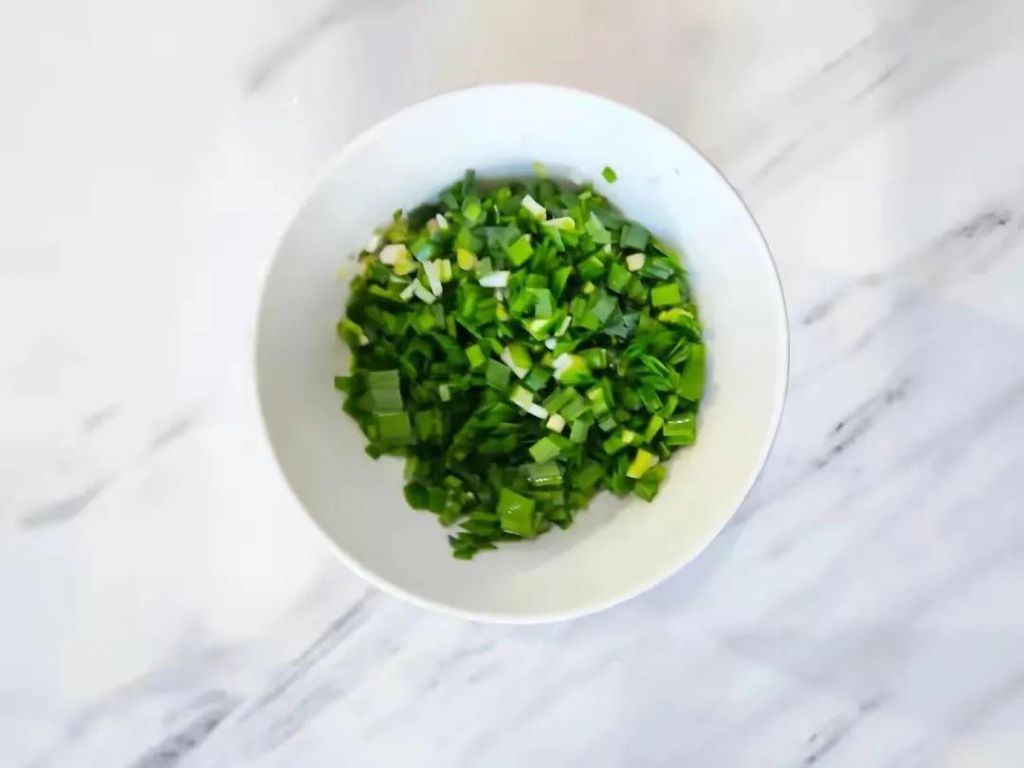 1、韭菜洗净切碎末,装入小碗中。