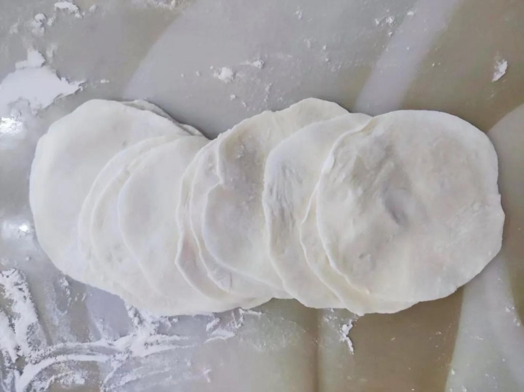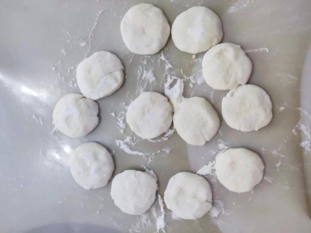 6、醒好后的面团儿非常柔软,直接取出来放砧板上,砧板记得提前撒干面粉防粘,接着把面团儿再稍微地揉一揉,大约揉个2分钟就可以。揉好后直接搓成长条,然后分成大小相等的面剂子揉圆,按扁。擀成薄皮。饼皮薄点更好吃。