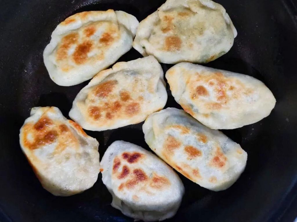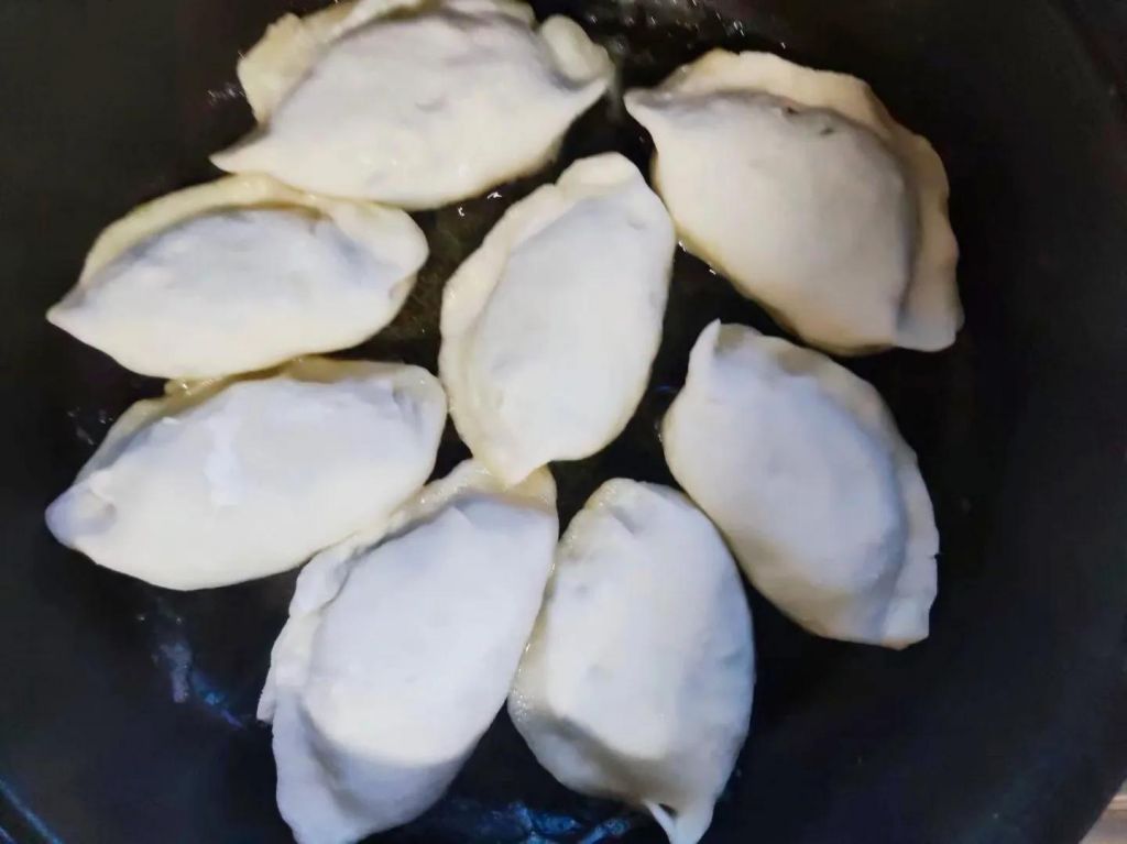 8、下面开始煎韭菜盒子。起锅烧油,油热放入韭菜盒子,煎至金黄,鼓起来,翻面,煎至金黄。