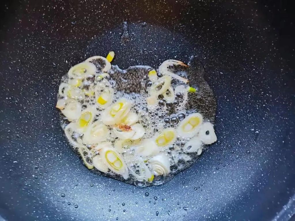 切点葱花和蒜片。起锅烧油,油热放葱蒜爆香。