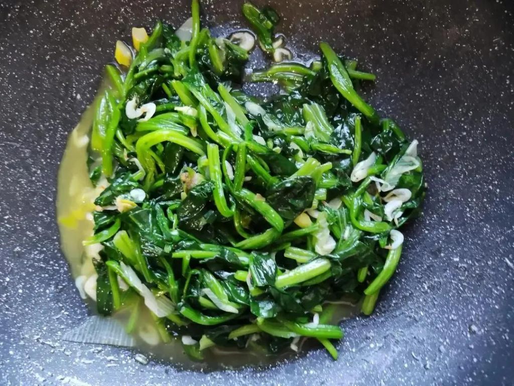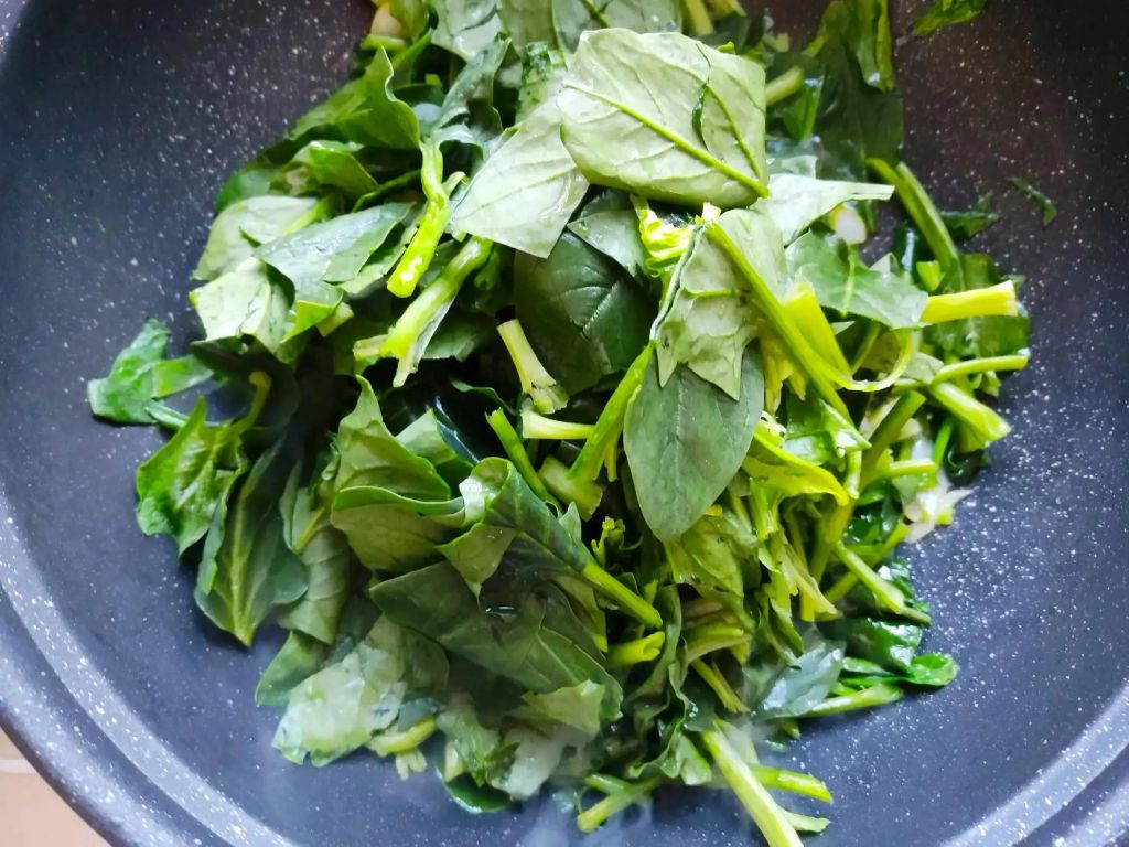2、放入菠菜翻炒一会儿,放入虾皮,翻炒一会儿。