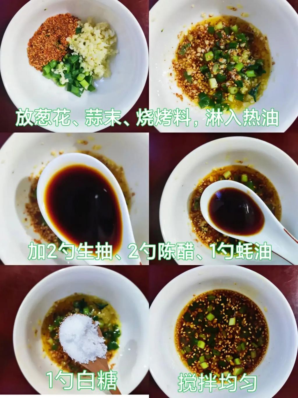 2、调料汁:小碗里放葱花、蒜末、一勺烧烤料,淋入热油。加入2勺生抽、1勺蚝油,两勺醋,1勺白糖,适量盐,灵魂调料汁就做好啦~!