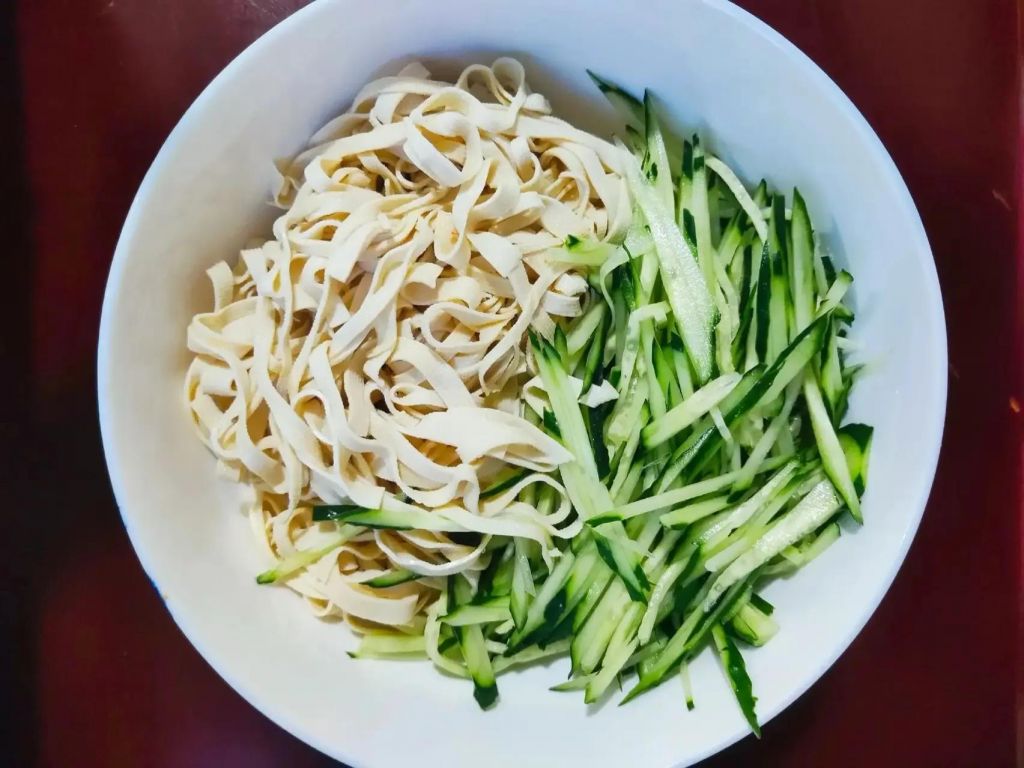 4、大碗里放豆腐丝、黄瓜丝。