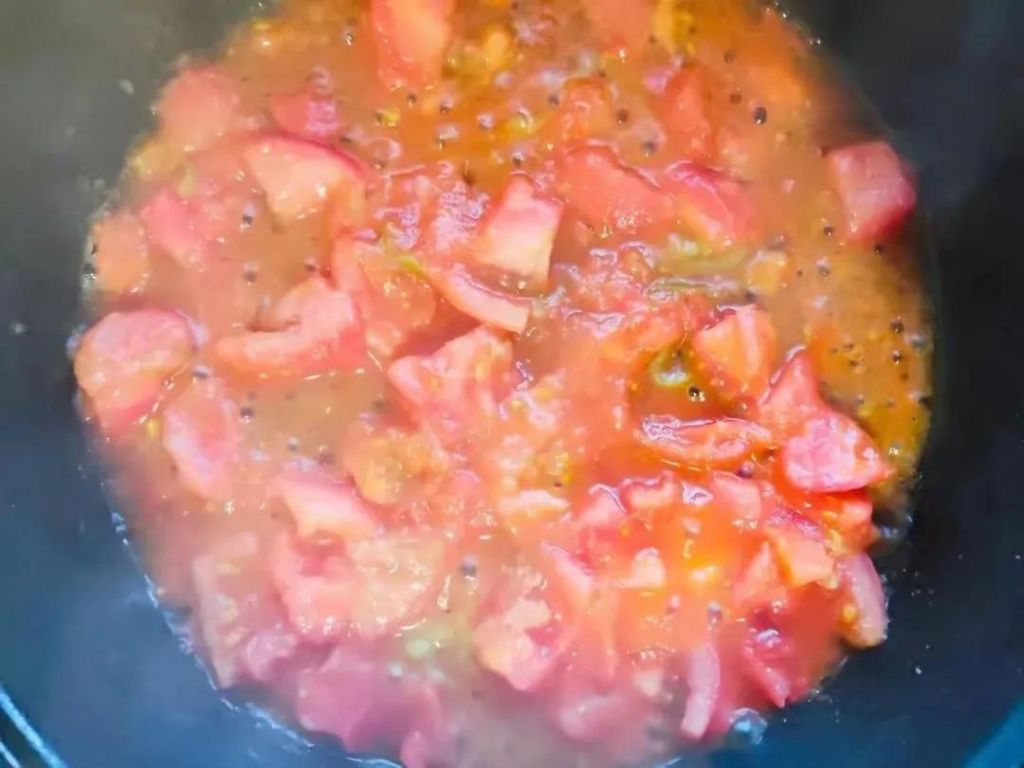 4、葱花爆香,倒入切好的西红柿,加1勺生抽,小火炒至西红柿出汤汁。