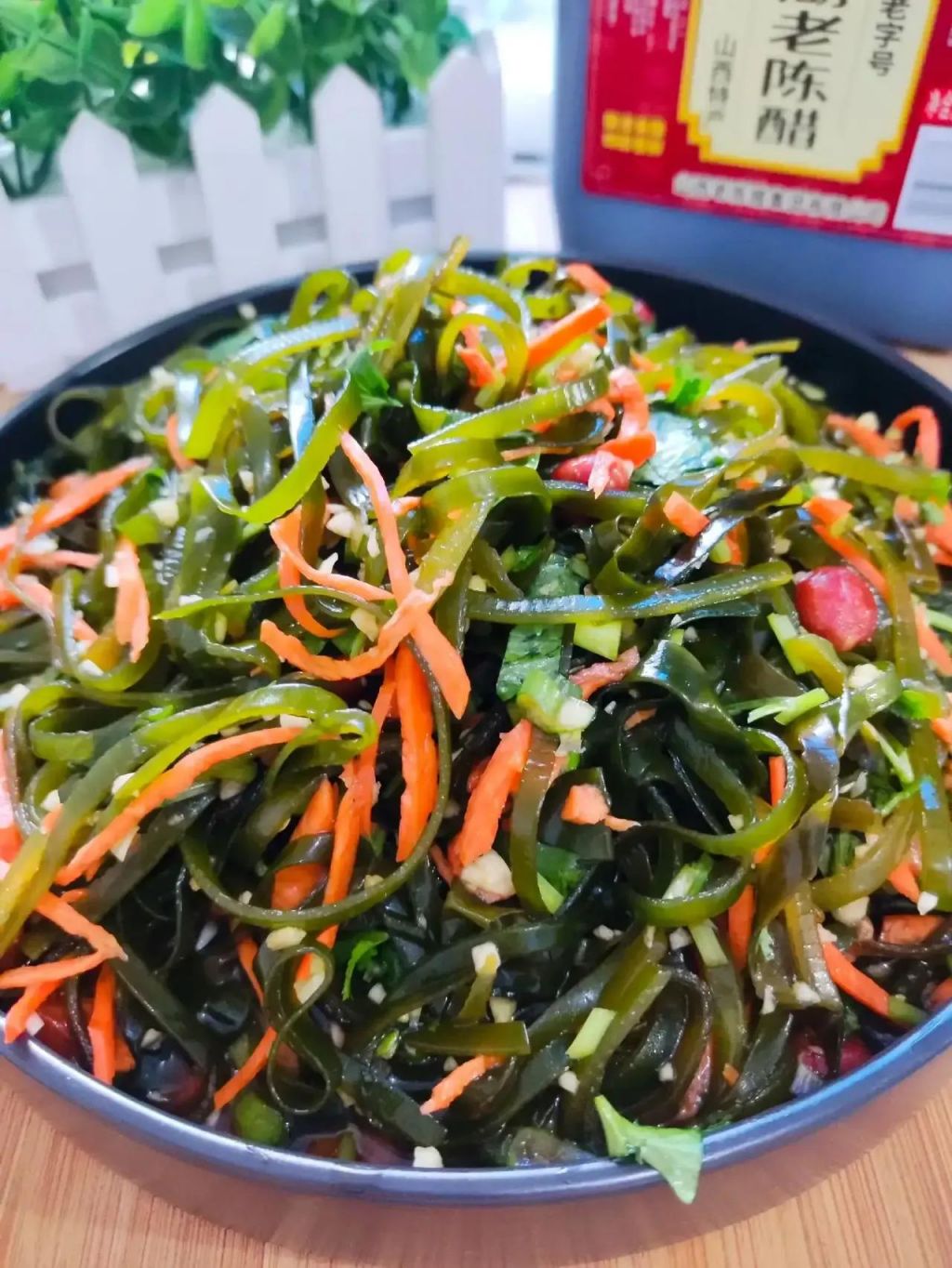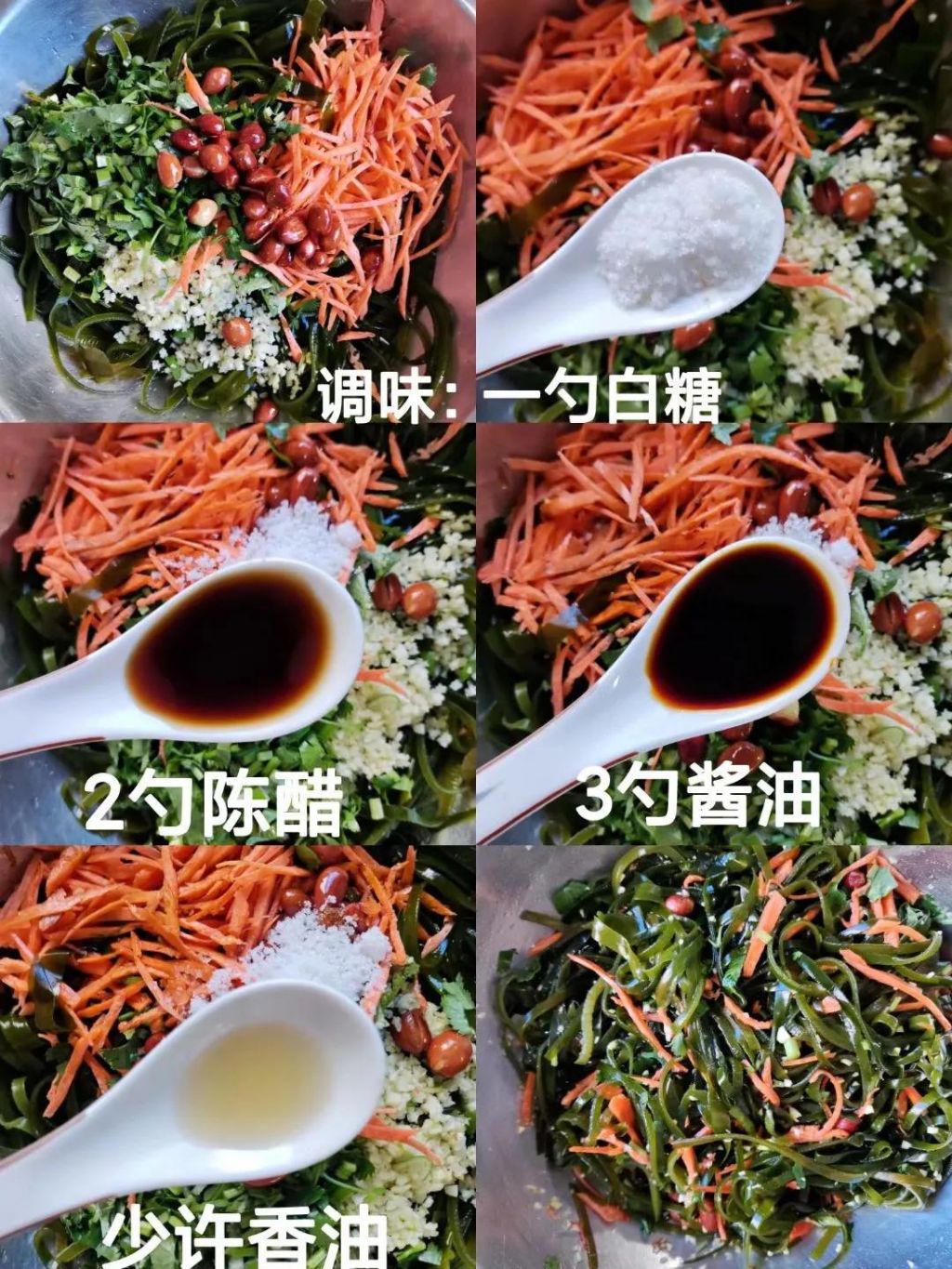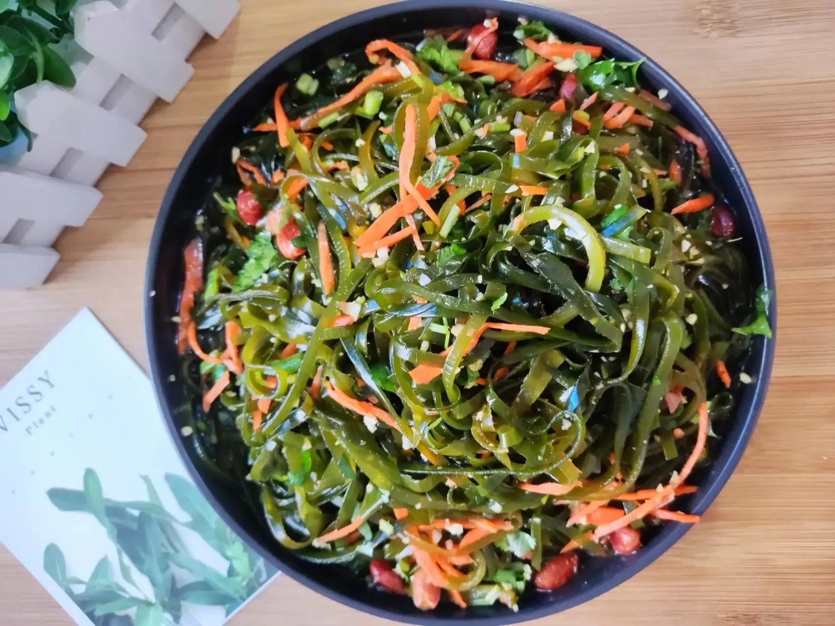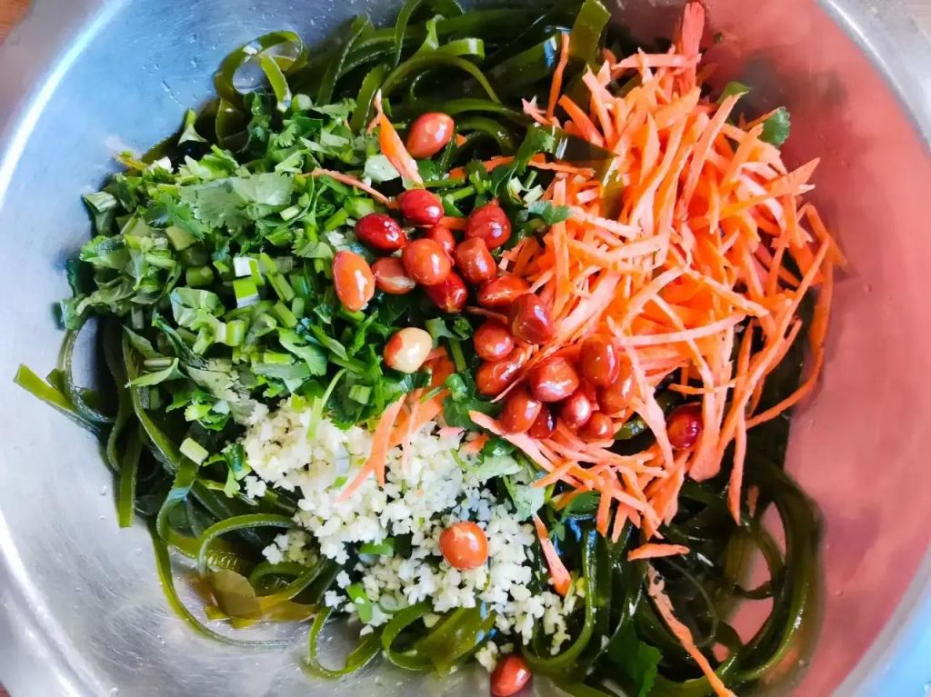 食材:海带丝、胡萝卜丝、香菜、花生米、大蒜