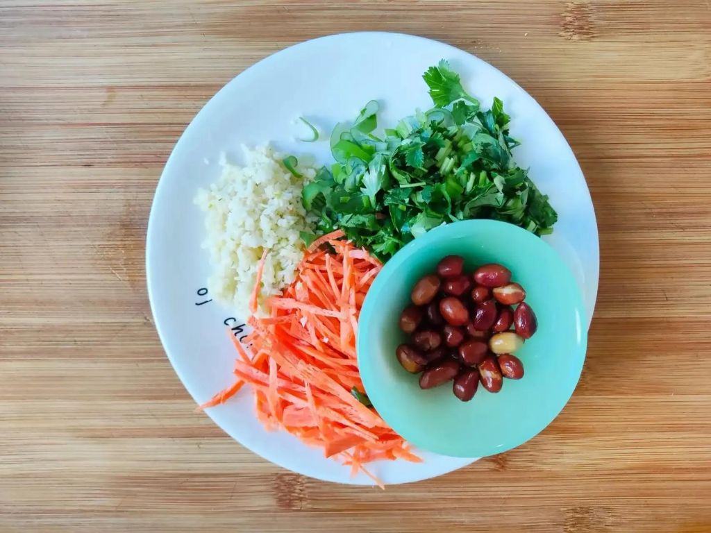 2、放入胡萝卜丝、香菜、蒜末、花生米,一勺白糖、2勺陈醋、3勺酱油,少许香油,拌匀即可。