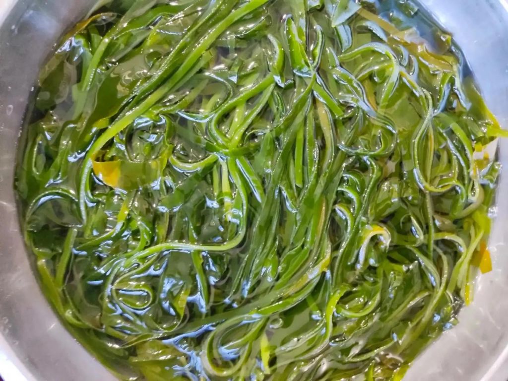 1、锅中烧水,水开下入海带,加少许盐,锅焯至变绿捞出。
