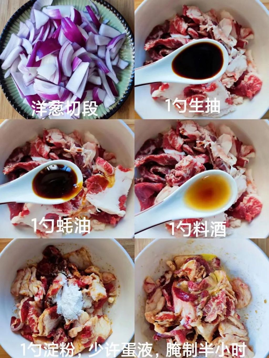 1、腌制牛肉:1勺生抽+1勺蚝油+1勺料酒+半勺淀粉+少许蛋液,腌制半小时。