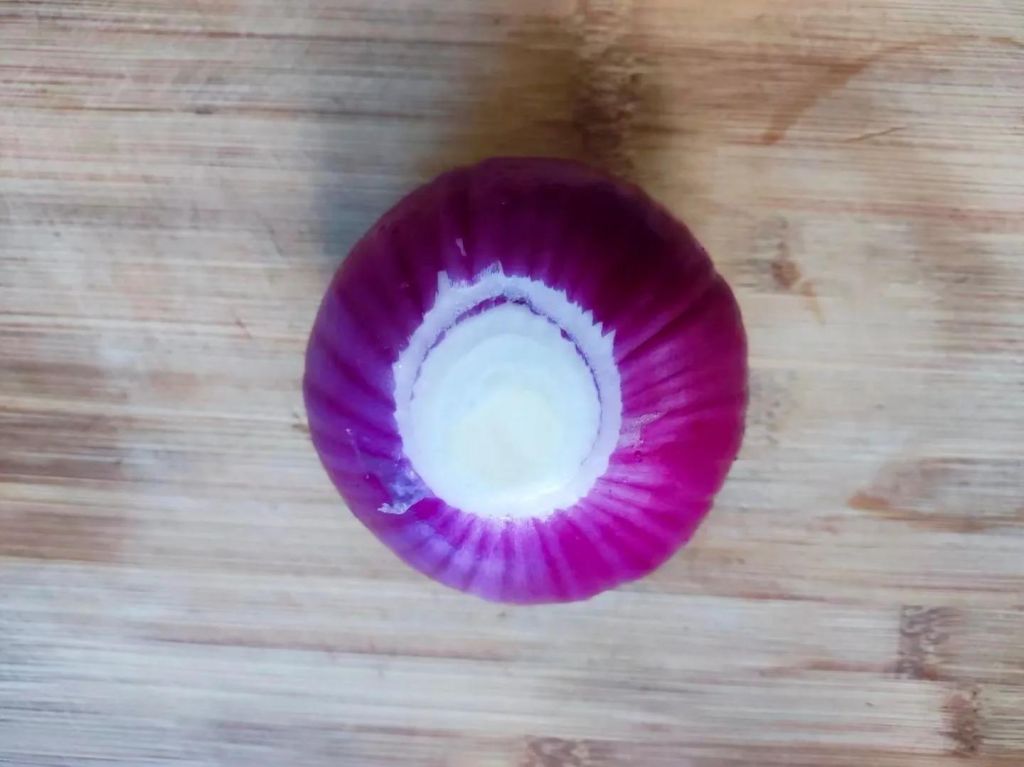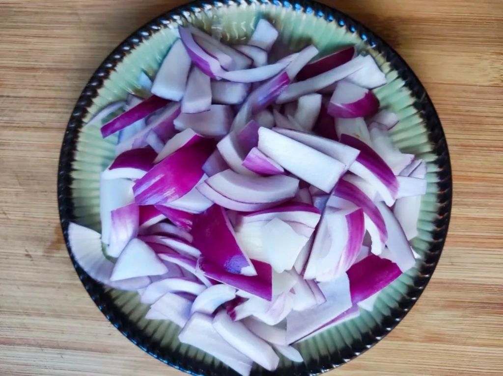 2、洋葱扒掉外皮,切掉根部。先对半切开。切条,再切段。