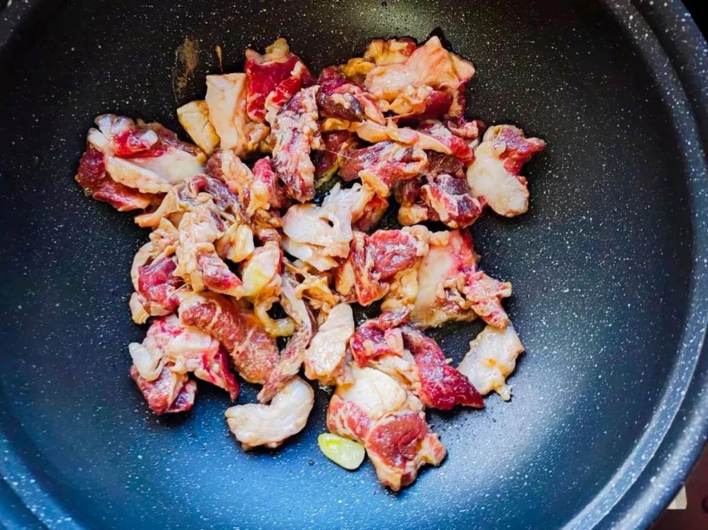 3葱切葱花、蒜切蒜片。起锅烧油,油热葱蒜爆香,放入牛肉翻炒至变色。
