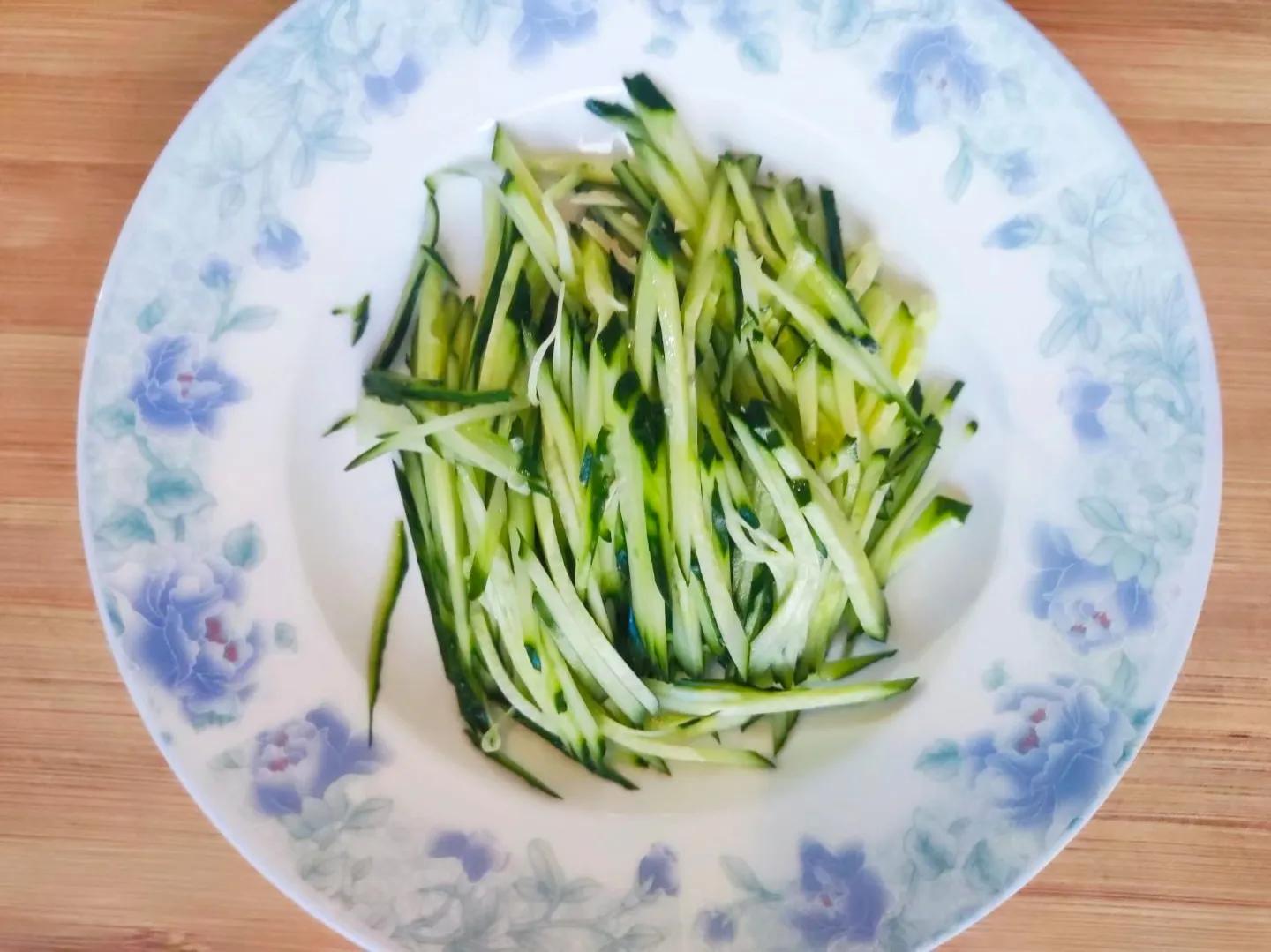 黄瓜切丝。切葱花、大蒜拍扁剁蒜末。