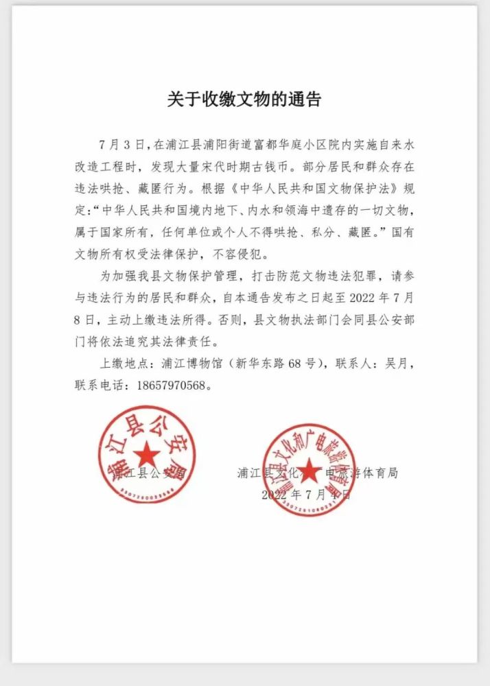 而针对此次古钱币发现过程中有居民和群众违规哄抢和藏匿的行为,浦江深夜发布消息,浦江公安局和文化广电旅游体育局联合发出了《关于收缴文物的通告》。