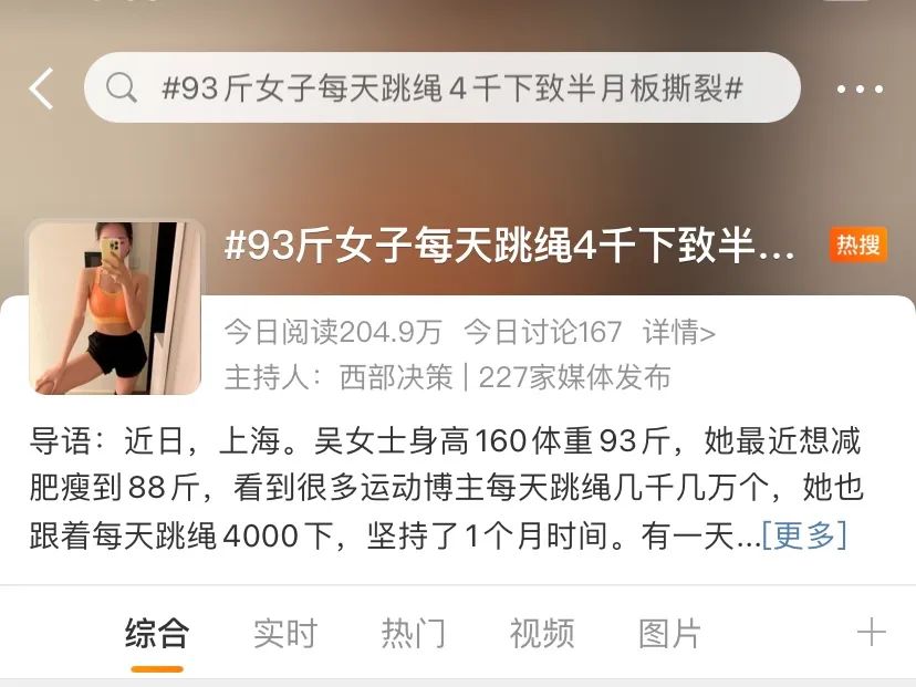 前段时间,“93斤女子每天跳绳4千下致半月板撕裂”的话题霸屏热搜。