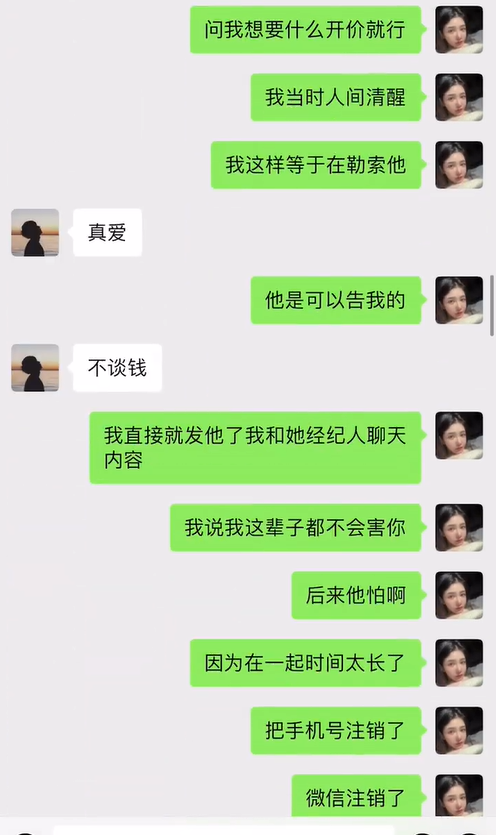 谈话中还提到明星经纪人要给郭子瑜钱,让她签订一个1500万的合同不要曝光李易峰,而自己人间清醒,知道拿钱就相当于勒索罪,害怕坐牢,一分钱都没要,还表示自己也很爱他,所以主动联系注销所有账号,表示一辈子不会害他。
