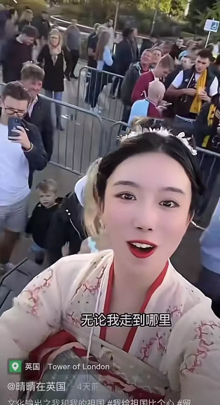 更令人無語的是,在國慶節當天,這位“晴晴在英國”又出現在人群中,身穿一襲紅白相間的漢服,又當眾高聲唱起了《我和我的祖國》,同樣也是全程走調、高音完全上不去。