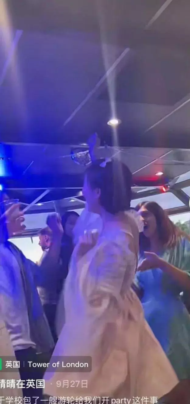 此外,這位“晴晴在英國”還特別喜歡大眾花式表演,明明是在學校組織的游船晚宴上,她一會當眾大聲說著四字成語的祝福詞。