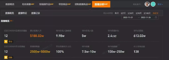 根据新抖数据显示,11月21日至11月24日,张兰的直播账号累计开播12次,观看人次达5188万,销售额在2500万元到5000万元之间,平均每场直播的销售额超过了一百万元。