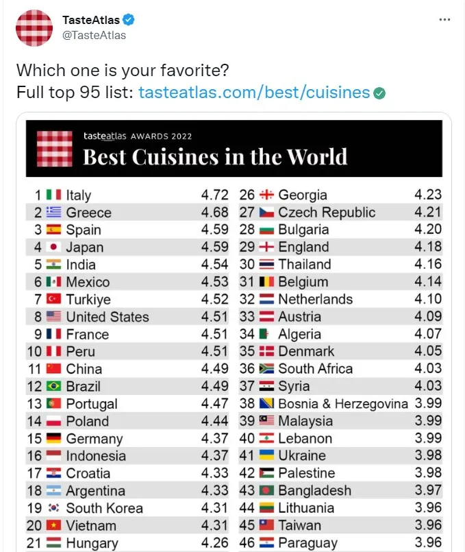 “国际美食指南”Taste Atlas总部在保加利亚,根据所谓的排名,国际美食前5名是意大利、希腊、西班牙日本印度。此外,中国第11名、韩国19名、泰国30名,都排在台湾美食之前。