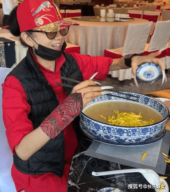 一次用餐,杨丽萍吃得非常开心,就连口罩都还没有完全摘下,就开始用餐了。