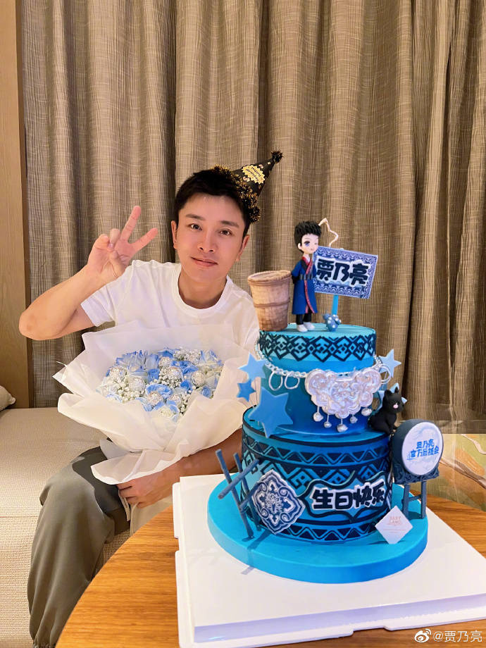 还有一个蛋糕是由“贾乃亮官方后援会”的粉丝们送的,这是蓝色的蛋糕,看上去显然成熟了许多,而贾乃亮依旧是对着镜头摆出了剪刀手的造型,另一只手则是捧着鲜花,脸上也露出了幸福的笑容。