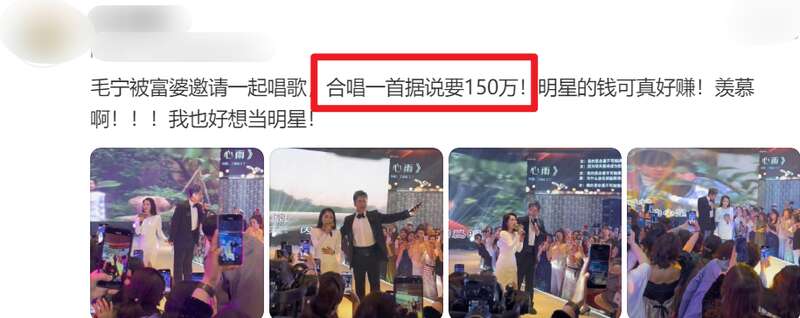 近日,有网友晒出毛宁商演的画面,原来毛宁是被富婆邀请过来一起合唱的,并且据说毛宁一首歌收费150万元,网友们都纷纷留言:当明星真好,赚钱真的是好容易啊!